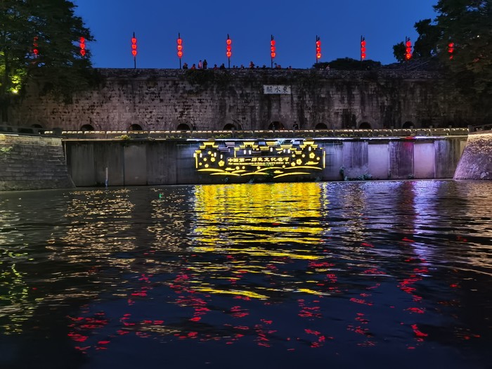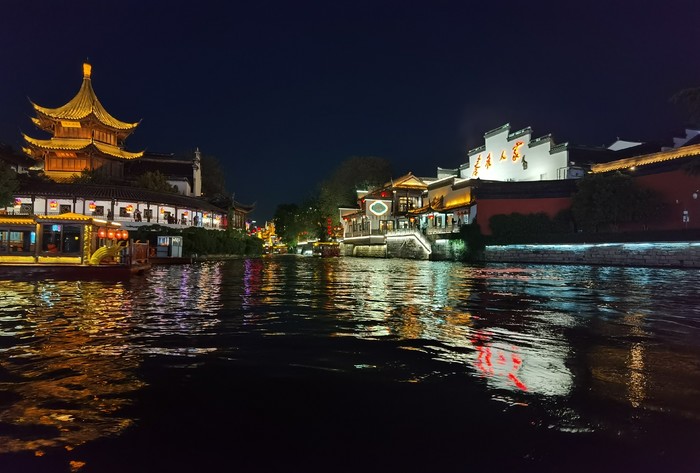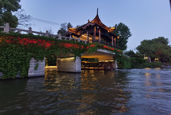 坐在船上,夜幕垂垂,岸边亮起灯火,让我想起朱自清的散文《桨声灯影里的秦淮河》,想来秦淮河的夜色也是感染了诗人,“从两重玻璃里映出那辐射着的黄黄的散光,反晕出一片朦胧的烟霭;透过这烟霭,在黯黯的水波里,又逗起缕缕的明漪。……那漾漾的柔波是这样恬静,委婉,使我们一面有水阔天空之想,一面又憧憬着纸醉金迷之境了。等到灯火明时,阴阴的变为沉沉了;黯淡的水光,像梦一般;那偶然闪烁着的光芒,就是梦的眼睛了。”