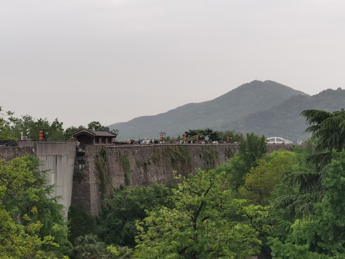 站在鸡鸣寺平台上,放眼望去是明城墙,古老的灰色掩映在青绿中,更显沧桑古朴。