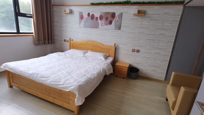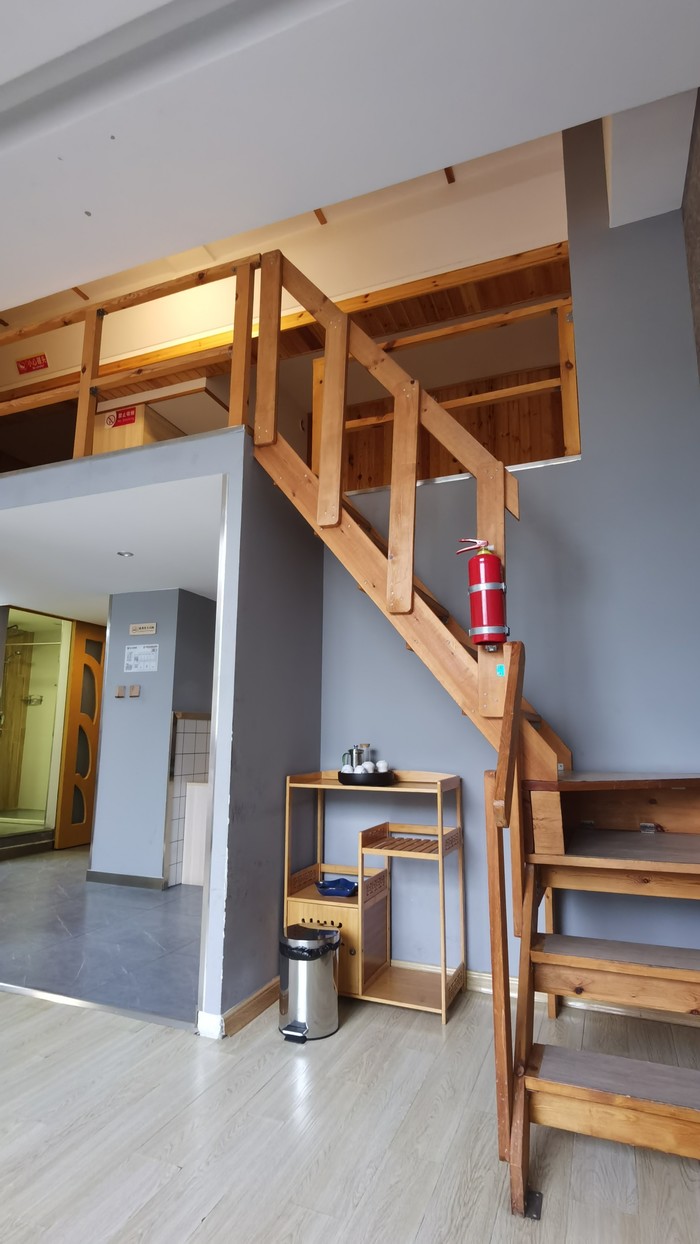 来的时候,门口的路正在修,不太容易找到,进了酒店扫身份证入住,每张房卡收100元押金。酒店是八十多平米的loft,房间很大,卫生间还是干湿分离的,有冰箱,有洗衣机,住几天也都完全没有问题。楼下的卧室很大,冬天挂大衣,放行李都更方便。楼上的卧室进去里面很高,人完全可以站直,感觉空间很大,其实住六个人都完全没有问题。
