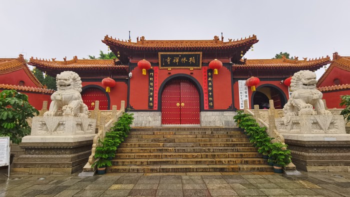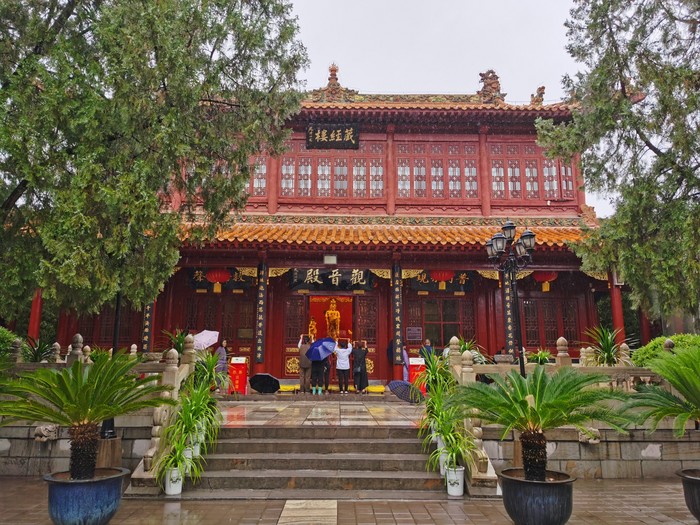 一路在往北走就是柏林禅寺, 08:00-16:00开门,门票免费。柏林禅寺建于汉献帝建安年间,玄奘在西行印度取经之前,曾来此从道深法师研习。寺内主要建筑有山门、柏林寺塔、与普光明殿,其中供奉有重达十吨的汉白玉贴金本师释迦牟尼佛像。进来路上会有出售乡和讲解的,有需要的小伙伴可以听一听。我用的APP上的讲解,一路在雨中满满逛。目前只看放了中路的山门殿、舍利塔、普光明殿、观音殿和万佛楼。跟随人工讲解+参拜大概也只需要0.5-1小时。观音殿内的观音菩萨是由柏林禅寺内一棵枯掉的千年古柏树干雕刻并贴金而成,值得一看。柏林禅寺还会组织生活禅夏令营,感觉应该会很静心。