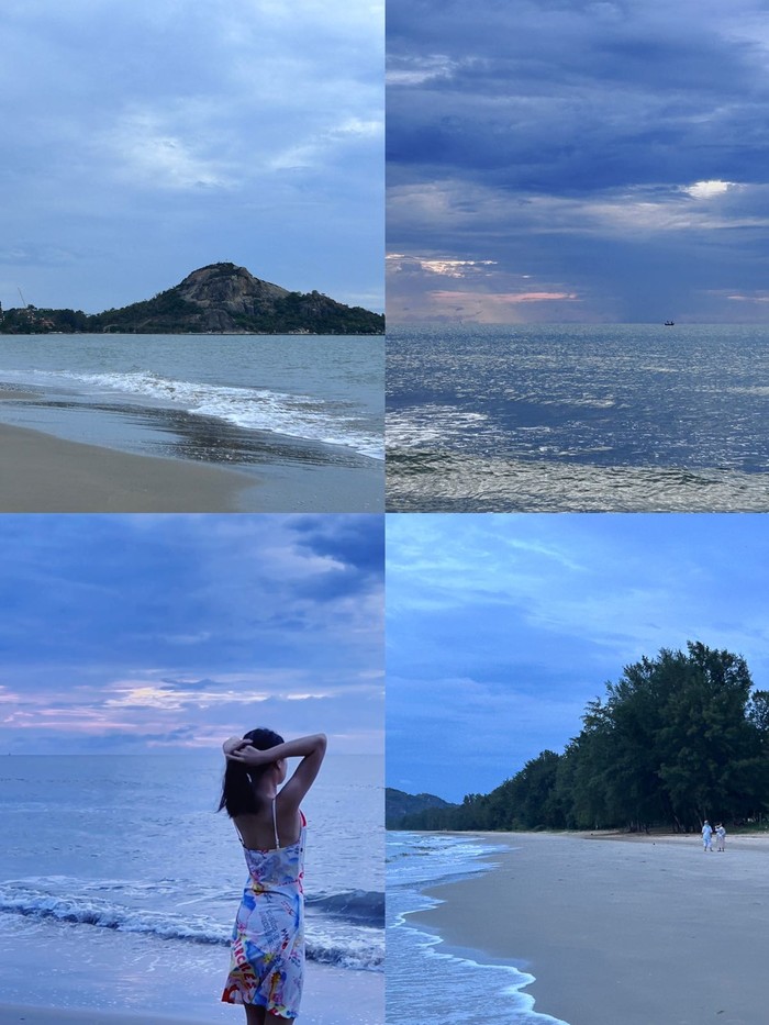 沙子绵细,海滩平缓,有山有树,拍照出片。