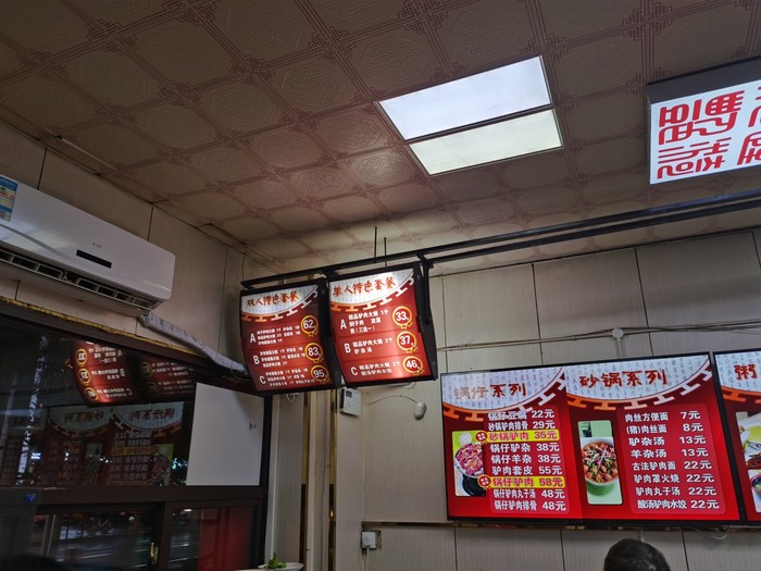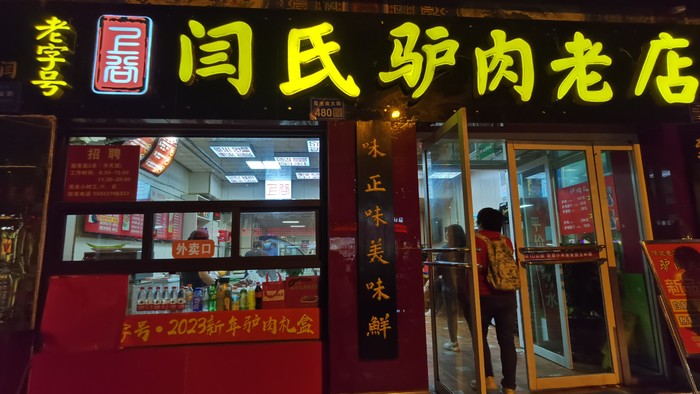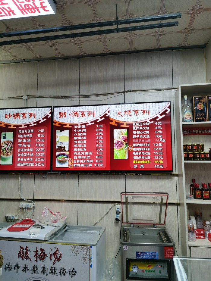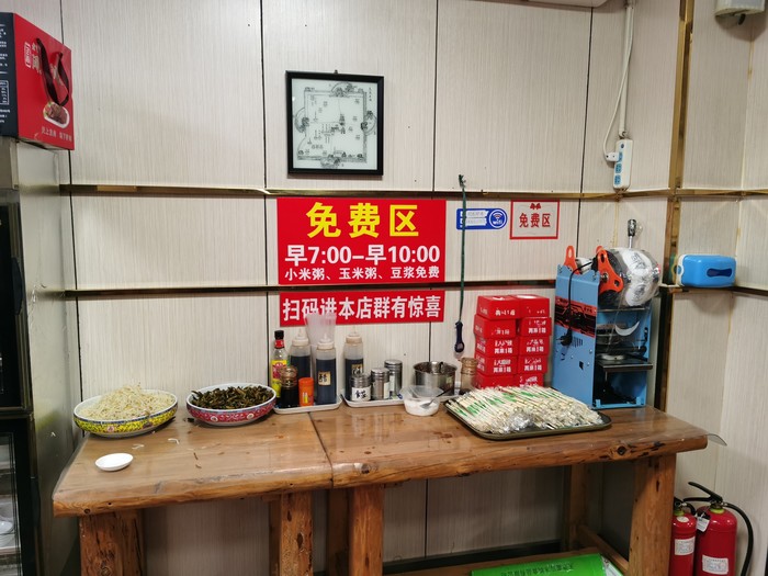 进门儿的时候被告知已经不能堂食了,而且只有火烧汤已经没有了。看来是太火爆了,我们来的比较晚,要了三个肥瘦相间的火烧。等他切的时候顺便看了一下店里,一个小料台有免费的咸菜各种调料。早上10点之前还有免费的小米粥玉米粥和豆浆,感觉应该会很划算。驴肉一般会有些咸,所以搭配粥一般要好很多。