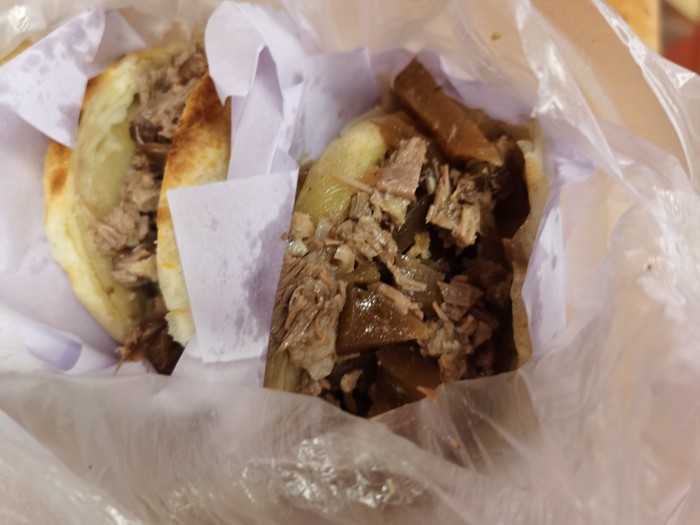 拿到火烧以后,我们有一丝丝惊讶。才发现原来保定的火烧居然是圆形的(第二天在保定博物馆里也看到了介绍),肉肉肥瘦相间,给的量确实不少,就是可能晚了,饼不是特别热,肉也有点儿凉,吃着口感稍微差一些,建议想来打卡的小伙伴儿一定要早来早来早来。