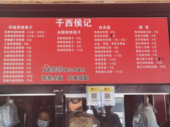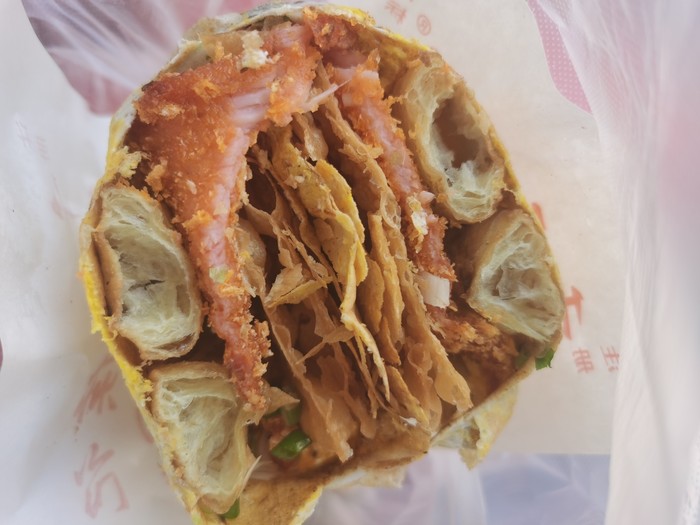 我来的时候十二点半,外面的队伍不算长,每队不超过十人。煎饼价格真的是很实在,最普通的只要5.5元一个。我要了里脊的,8元,小姐姐建议我双掺,既有薄脆也有油条,真的是满满的一大个。