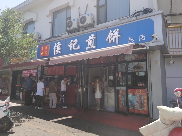 位置:济南市历下区经11路32-10号。沿着千佛山北门一直往西走,过了济南市博物馆,十字路口西南角就是。他家外面就能看到一共三个收银口。左侧两个是煎饼的,右侧是烧饼夹肉。