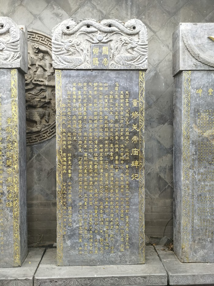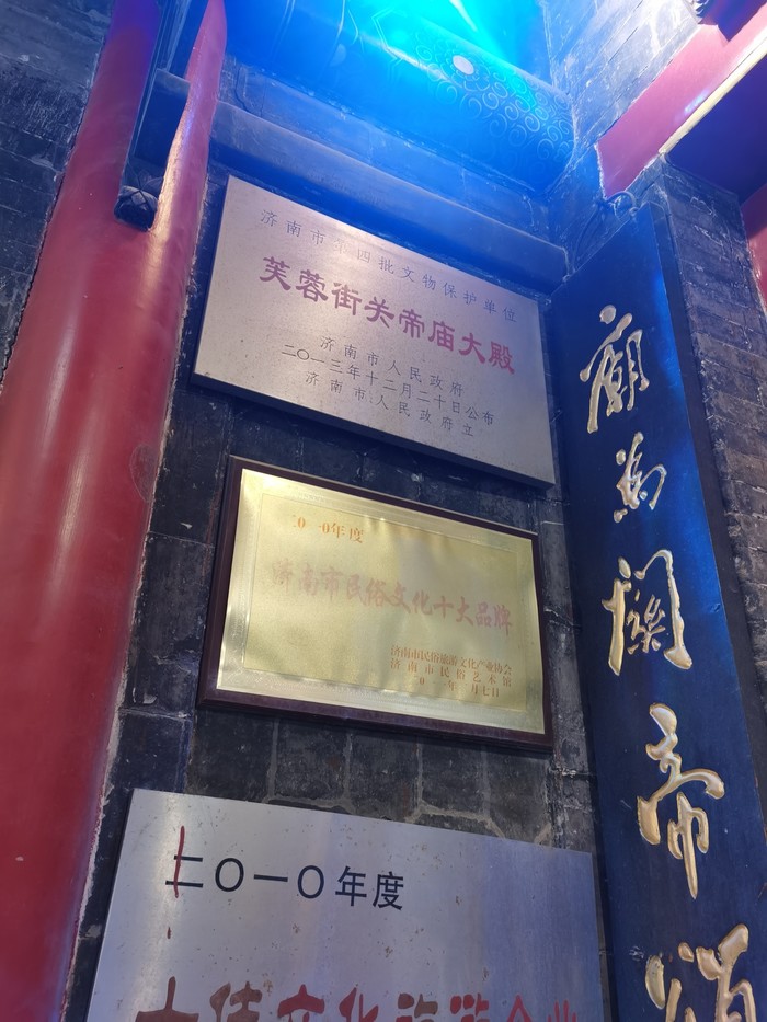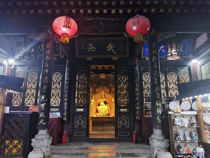 坐落在芙蓉街上,网传开放到17点30,不过我19点到的遗址开着,免费参观。关帝庙始建于清代中期,现建筑由民宅式庙门一间、正殿三间及新建的南北厢房组成,庙门为硬山顶,正殿为卷棚顶。庙一进门两侧有石碑,包括清康熙五十九年(1720)《重立考棚碑记》和光绪二十五年(1899)《重修芙蓉街北首布政司小街东口路东关帝圣君庙碑记》,看着很清晰。两侧配殿现为摊位,正殿内为关帝老爷,可以参拜祈福,周围还有辟邪文创出售。