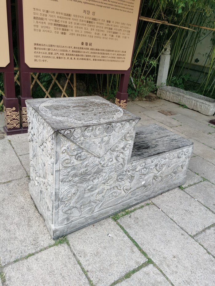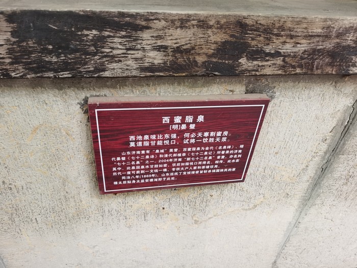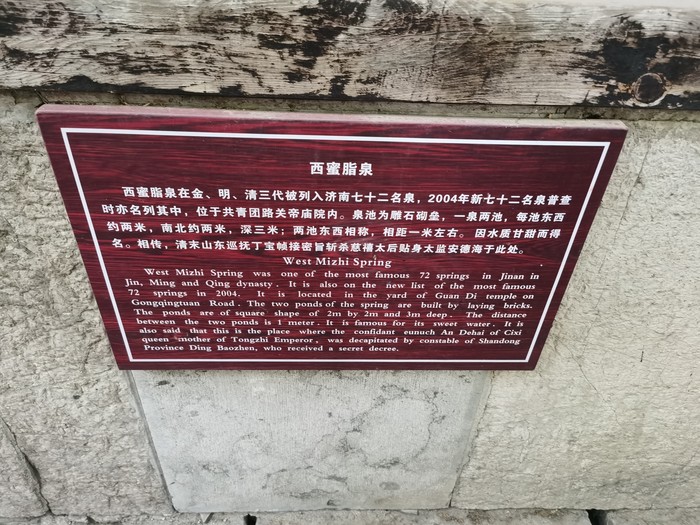 走过来的时候发现运气很好,有师傅正要锁正殿的门,于是赶紧打了声招呼,迅速进去看了一眼,和武财神打了声招呼就赶紧出来,不打扰师傅下班了。西蜜脂泉是俩个方方正正的泉,水和刚才在趵突泉公园看到的相比清澈度稍差一些,也没有看到明显的气泡,不过里面还养着鲤鱼,墙上有对西蜜脂泉的介绍。左侧进去还有户外的关老爷,信奉的小伙伴可以拜拜。