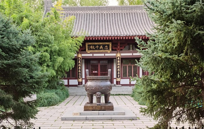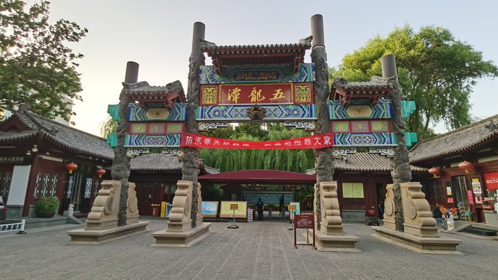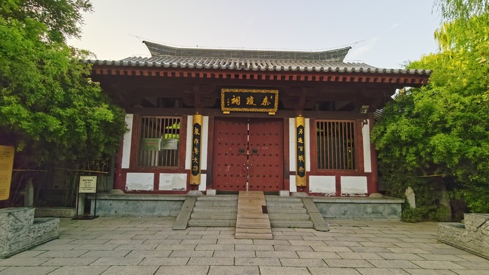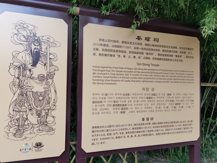 传说五龙潭为隋唐英雄秦琼宅邸,后因暴雨陷落下沉成为今日的五龙潭。为纪念唐朝一代名将——秦琼,济南市园林部门在2009年五龙潭公园北区扩建工程中,于秦琼故宅旧址上恢复重建了秦琼祠。秦琼祠是一个单独的院子,北侧为正殿,东西两侧有廊,大门外有下马石,门前有影壁。目前免费开放,时间充足的小伙伴可以进来打个卡。