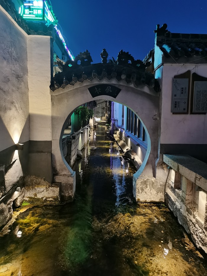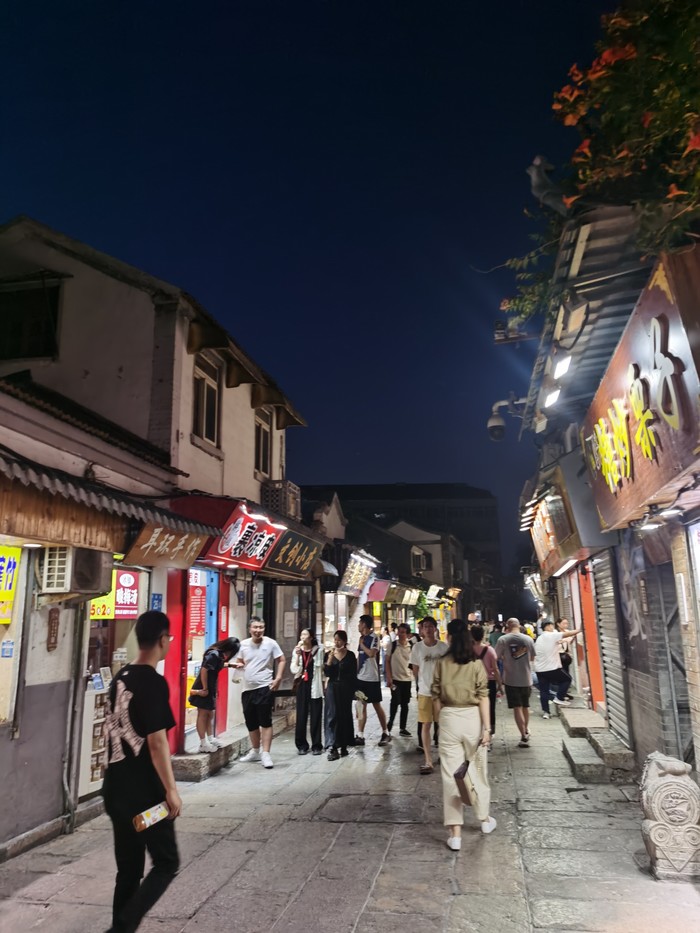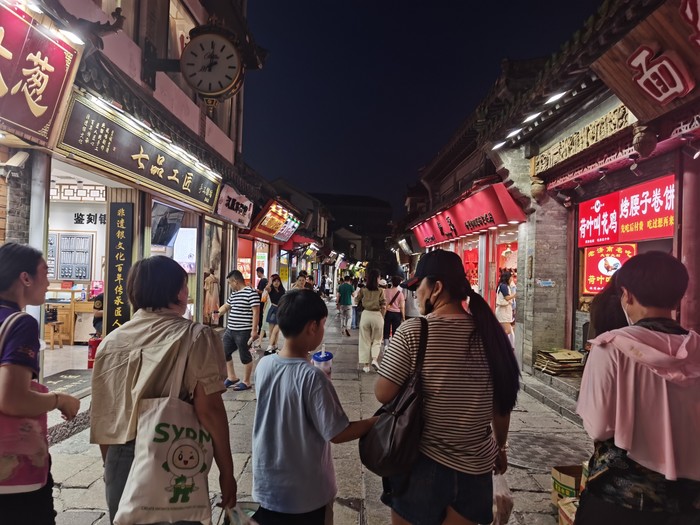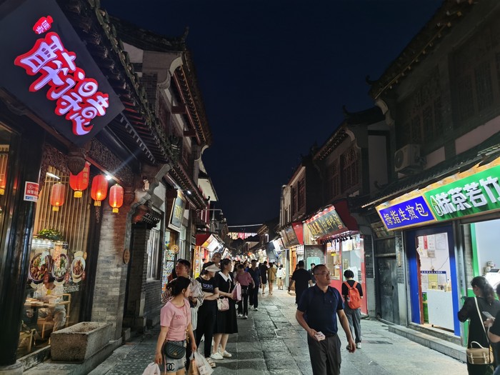 芙蓉街北起济南府学文庙,南至泉城路,因街中芙蓉泉而得名,是济南市的老商业街。晚上八点多的老街正式热闹的时候,路两侧店铺林立,特色小吃和小店很多,人头攒动。附近的其他小巷子也多数亮着灯,偶尔某条街的宁静有一种闹钟取静的感觉。