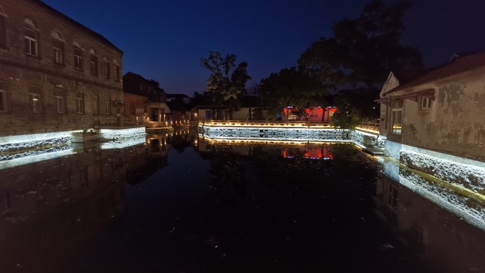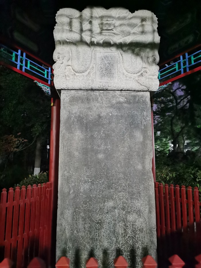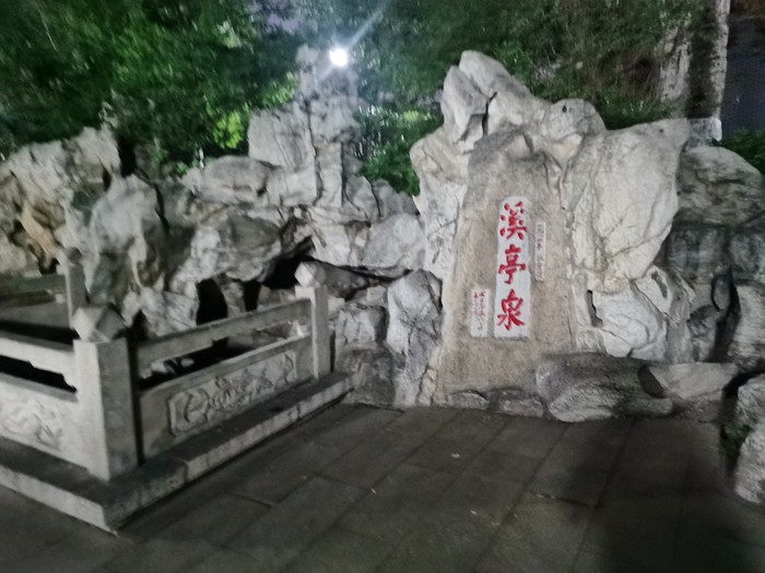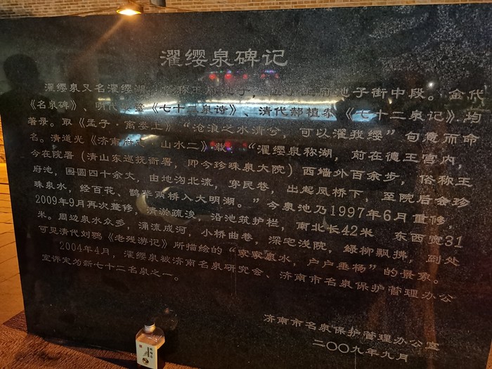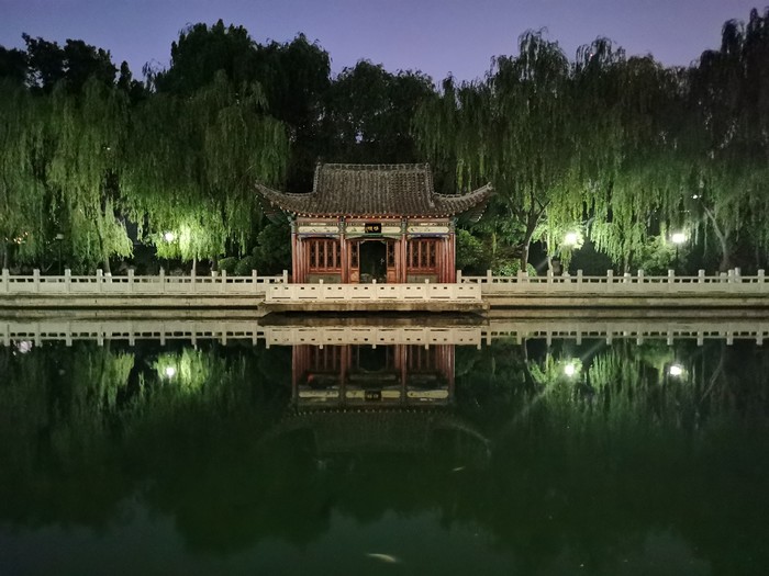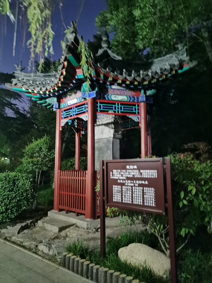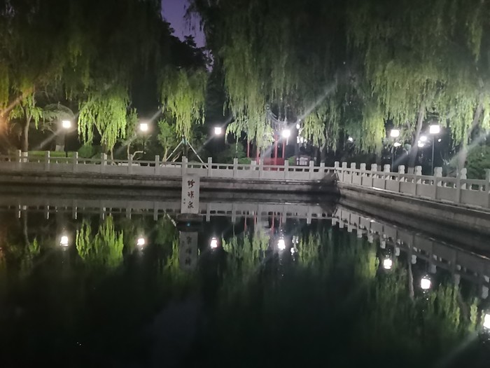 跟随导航到了人大门口,我特意问了保安大哥是不是能参观,大哥很热情的告诉我可以参观,是珍珠泉,并告诉了我位置。一路上光线有些暗,与游人如织的趵突泉相比,珍珠泉所在院落要清幽得多,来这里赏泉、散步很是惬意。珍珠泉面积不小,泉水清澈,能清晰的看到气泡,因形似飘撒的珍珠,故有“珍珠泉”之美称。传说,珍珠泉的串串“珍珠”是当年舜的两个妃子——娥皇和女英的眼泪所化。沿着泉走到对岸还有一座乾隆的御碑亭,晚上虽然看不太清,不过拍了照放大照片还是很明显的。人大的北门普通人不能通行,还需要从南门返回。