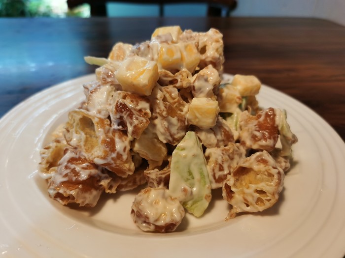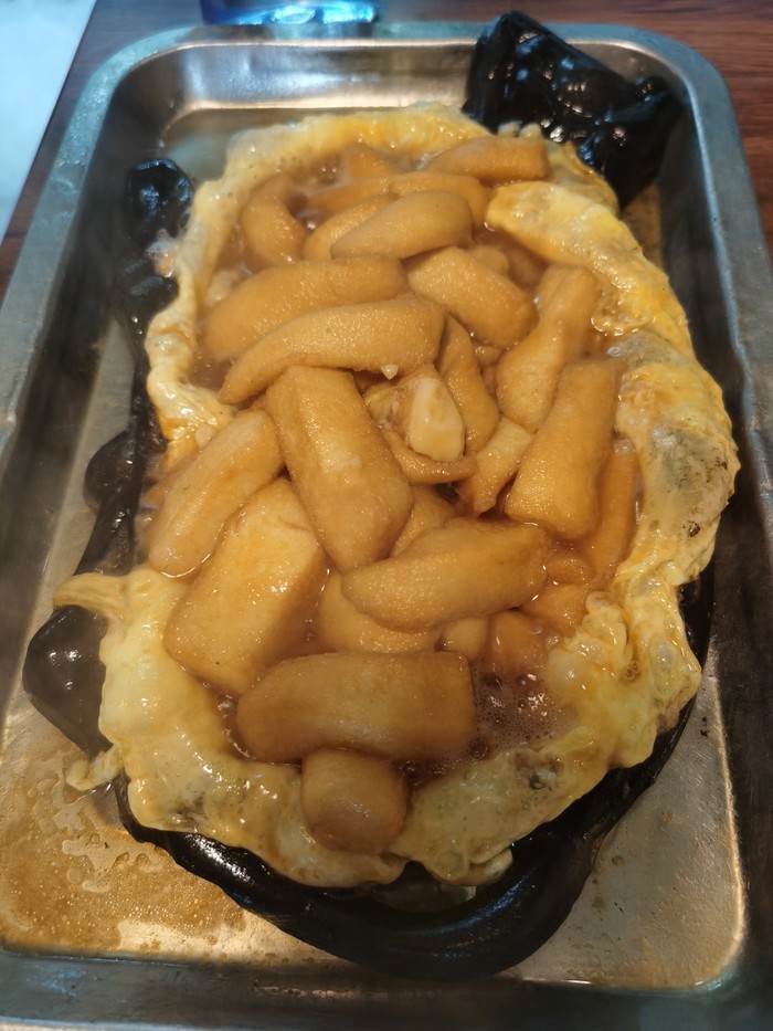进来可能小高峰刚过,不用排队,外面正好空着个小桌。我一个人店主也给我上了一壶热水,感激。点了招牌的铁板豆腐和菠萝拌油条。菠萝拌油条里面也还有搭配一点黄瓜,搭配的沙拉酱,微甜、爽口、不腻。油条脆脆的还可以当主食,很好吃。铁板豆腐上来的时候还是热热的,下面是用鸡蛋饼垫着。豆腐是日本豆腐那种口感,不过微咸,所以我是搭配着油条和鸡蛋饼一起吃的,鸡蛋反而是西红柿炒鸡蛋的那种微甜口。他家菜量不小,我点的比较素,都吃了刚好晚上继续暴走。人多的小伙伴推荐啤酒爆鸡,旁边桌点的多,看着很诱人。