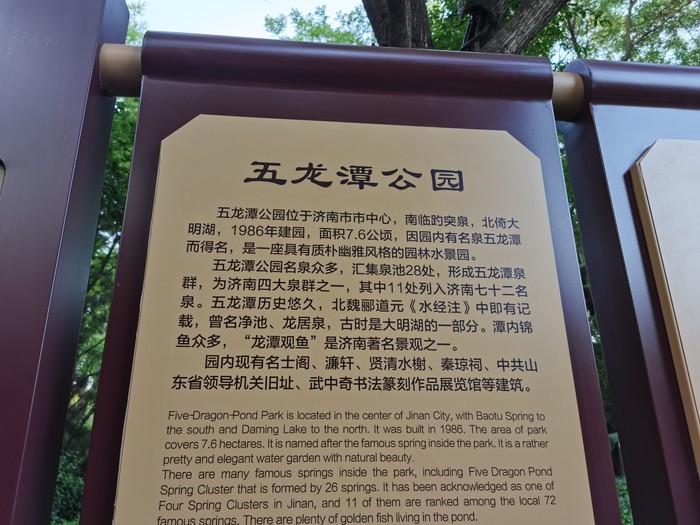 五龙潭公园位于济南旧城西门外,南临趵突泉,北接大明湖,潭周名泉众多,形成五龙潭泉群。
