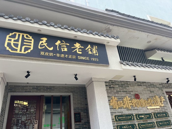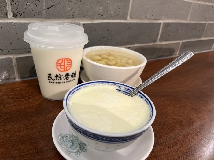 吃完午饭步行前往民信老铺(双皮奶博物馆),排队人是真多,前面146桌,不过喊的也挺快,等了大搞半小时就进去了,这个过期要重新排队哈,不能离开太久。点了一份双皮奶,一份糖水,一份水牛奶。个人更喜欢民信老铺的双皮奶哈哈哈,糖水不会很甜,水牛奶超赞!