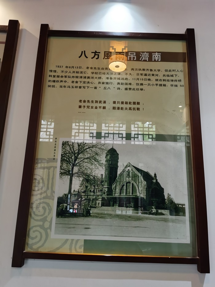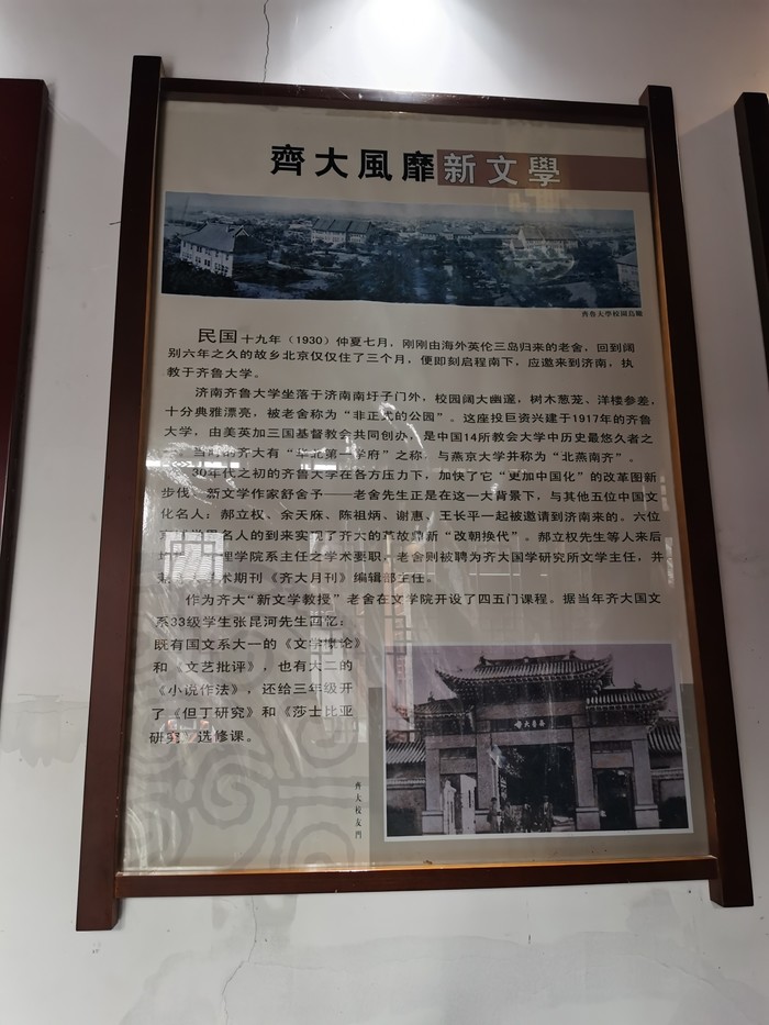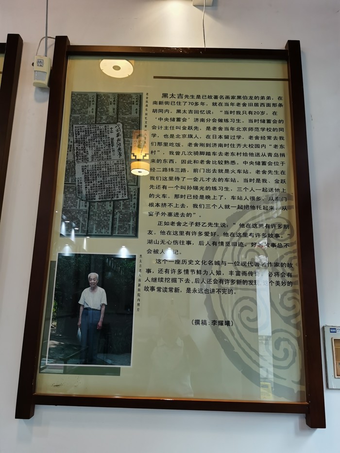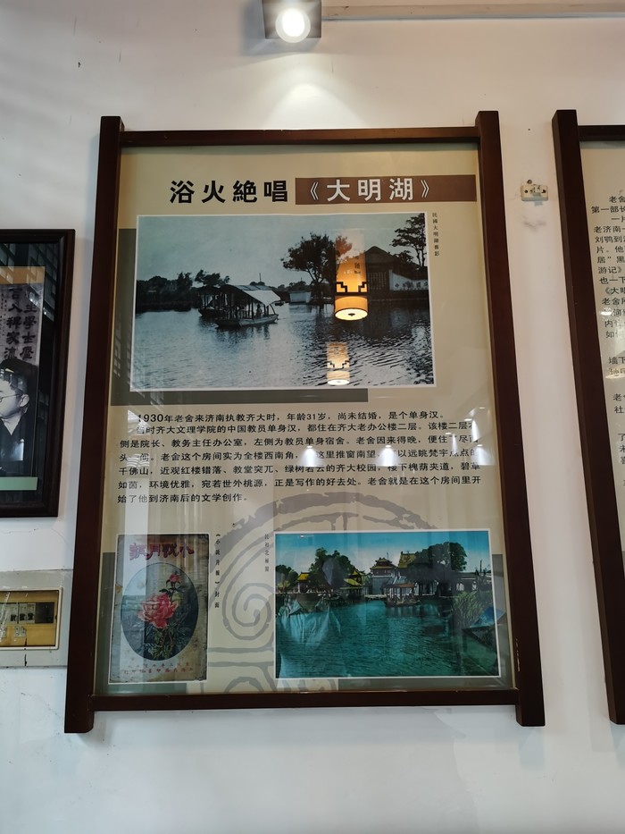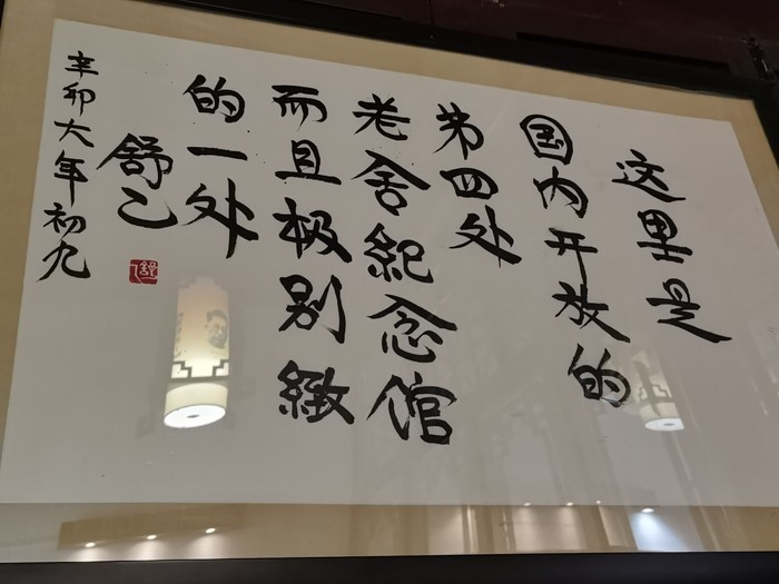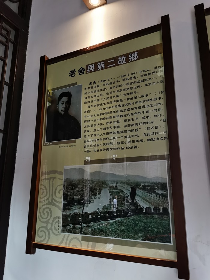 纪念馆面积不大,只有一个小四合院,门口“老舍纪念馆”的匾额由老舍儿子舒乙亲自书写。纪念馆门内的白色墙壁上还雕刻着老舍的名作《济南的秋天》,勾起无数人的回忆。里面是对老舍的介绍,我是第一次知道原来老舍先生写过大明湖,可惜毁于一二八的战火中,成为遗憾。感兴趣的小伙伴一定要来看看。