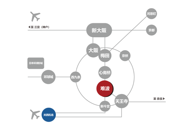 在关西国际机场搭乘开往南海難波的南海机场线电车,从「難波」站下车即到。(约40分钟)