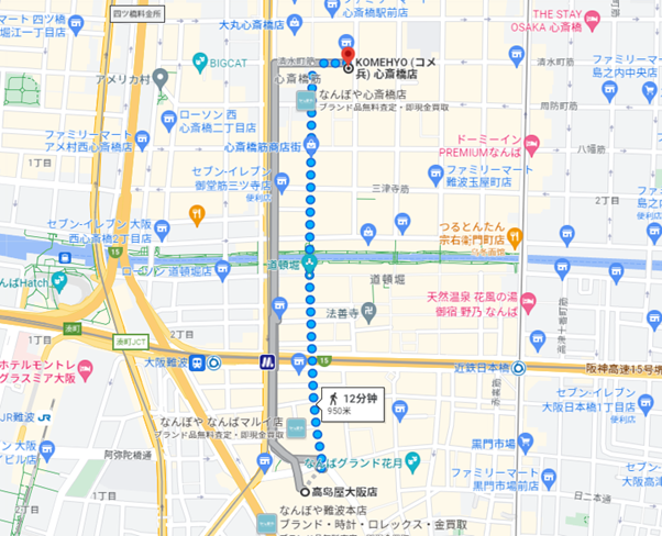 2.步行线路:从高岛屋“大阪店”出发的话,沿着“戎桥筋商店街”一直往“心斋桥筋商店街”方向走(北),走到“清水町筋”和“心斋桥筋商店街”交口右转,一共950米,大概10分钟就能到。
