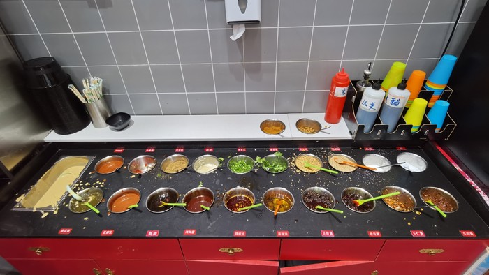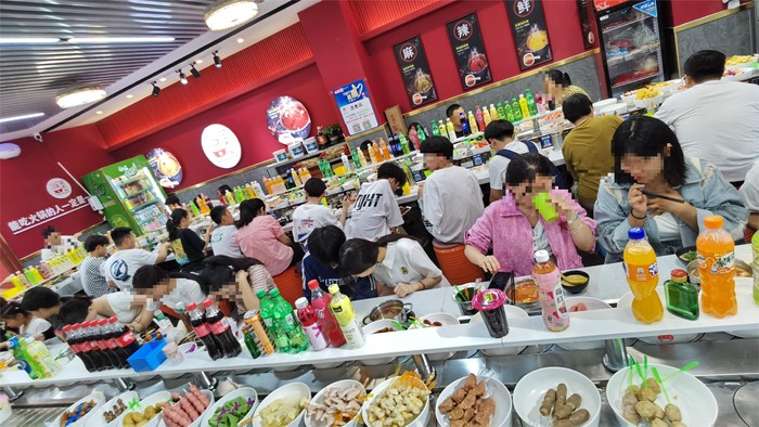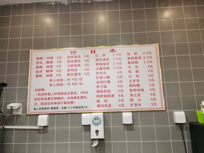 和老板确认了有位置以后立刻从网上团了圈,各种优惠加起来34.9自助,除瓶装水以外全含。他家的所有菜品都有不同颜色的价钱,可以单点,也可以直接自助。锅底3-5元,小料3元,机打饮料5元,菜品1-5元。他家是c型回转式,菜品种类很多,每一份的量也不少,单点价格也不太贵,学生党基本人均20。我是自助,没怎么吃主食,主要吃了很多肉肉类,他家丸子里都是海欣的,也是牌子货。