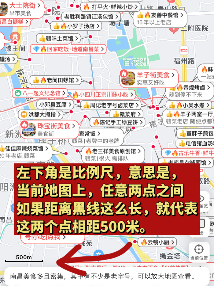每个地图的左下角都有一个比例尺。标明了当前地图上,一段线对应的长度,缩放地图,这一段线对应的长度也会发生变化。可以通过这一段线的长队,来估算两个景点之间距离。