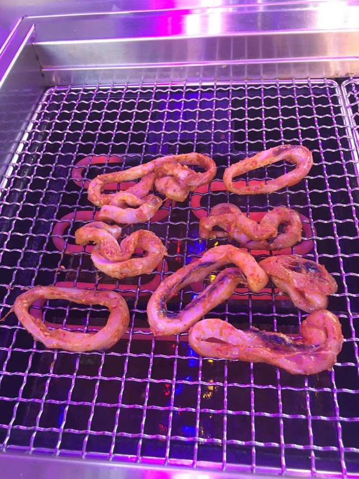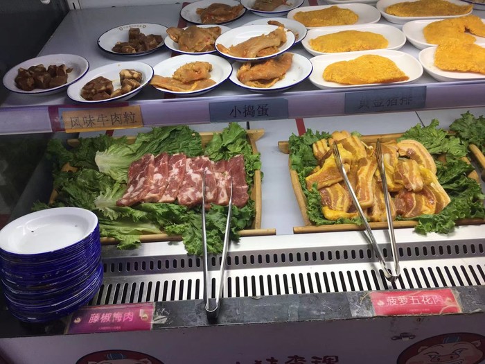 所有的菜品都在冷柜里,种类很多,清真的小伙伴儿可选择的也都很丰富。肉肉看着还是比较新鲜的,都是比较大块整切,品质还可以。海鲜种类也有一些,大家烤的时候要注意。个人比较推荐青花椒牛肉,很好吃哟!