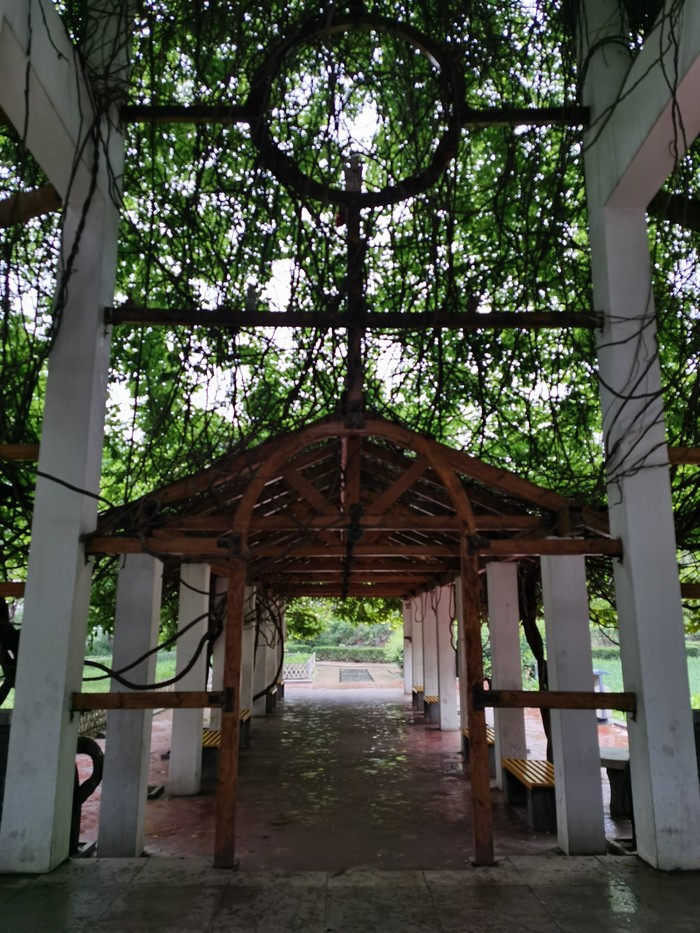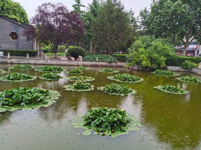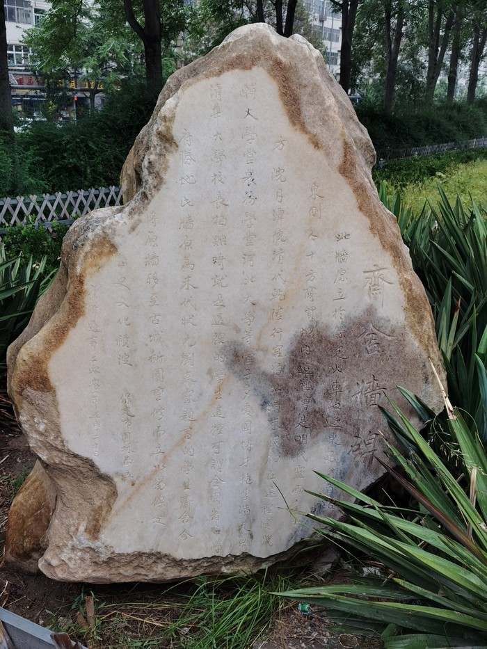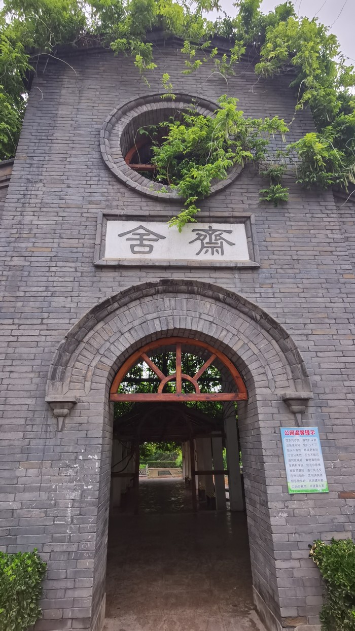 到了以后发现只能算是个小公园吧。外面有健身器材,前面有莲池,左侧是护城河,右边是西大街。所谓的斋舍现在只是一面厚厚的墙,后面是搭的架子,上面爬满了藤蔓,小雨的时候勉强可以避雨,大了不行。离的远的小伙伴不用特意安排来打卡。打算逛西大街的,可以这里打卡后再开始逛。