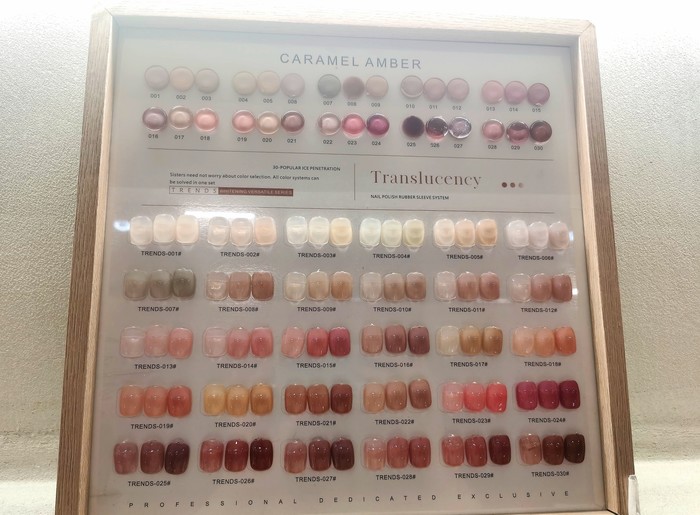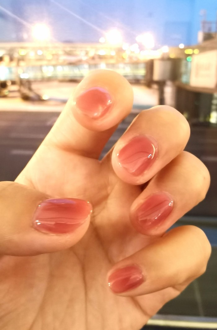 和店主小姐姐说了,预约的时间以后就进来了。他家现在都是预约制,所以不用担心过来会没有地方。小姐姐一边帮忙修手,一边选色号。出去玩想图个平平安安,所以想选偏红粉色系的。小姐姐推荐了图一的色板,感觉颜色是稍稍偏果冻的那种,很适合夏天,我一下子就相中了,挑选了感觉偏奶茶棕?的这样的色调。涂一层的时候颜色稍稍比较淡,两层感觉比较好,有那种透润的感觉,三层感觉更厚重一些,我试了以后选择了两层的效果。图5是日常室内灯光下的感觉,图4是黄色灯光下的效果,看着比较清爽,接下来15天的行程就都靠它出境啦。