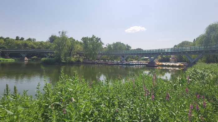 从济南市博物馆出来直接一路向西步行大概五分钟就是公园东门。公园里面高大的树木很多,建有松柏、牡丹、月季、竹、柳、菊、丁香等园,东方玉器艺术博物馆没有开放,面积最大的湖映日湖上面有游船项目,右侧还有2层KFC,可以进去凉快一下。公园内还有一个二层楼高的栈桥从西门差不多延伸到东门,白天有些晒,早上和晚上遛娃应该会不错。西门附近有个观赏温室,但好像也没有开放。我来的时候正好是最热的时候,虽然打着伞,户外还是太晒了,草草逛了一圈就离开了。