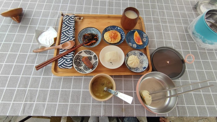 沿着温州沿海公路行驶,可惜晚上什么风景也看不到。凌晨两点多才躺到民宿的床上,第二天早上被雨声叫醒,老板给我们准备了早饭——佛跳墙套餐。结果娃娃们对羊栖菜喜爱度异常高