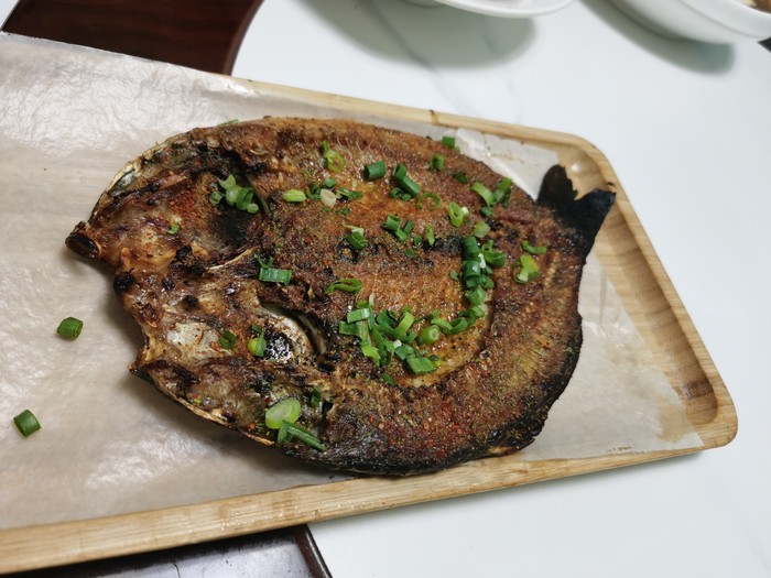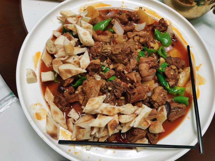 。他家菜单写的很酷,每一道都是招牌菜,我们团购了一条烤鱼和一个双人餐,弱弱地问了老板,可以一桌都使用,完全不嫌弃。又点了几个特色的回民菜。|疆味大盘鸡^大盘鸡盘子真的很大,我们尽量让少放辣椒了,里面搭配了土豆和青椒,我们吃着刚刚好。送了一份馍丁,小姐姐直接帮忙给下到了大盘鸡里,泡了一会儿就很入味儿了,不太吃拉的要早吃。|嫩烤稀麟鲑^高山鲑鱼是这边的特色,之前在赛里木湖就看到过,这次选了烤的,上来以后鱼肉质很嫩,微辣口,刺比较集中,老人和小朋友吃也很放心。|蒜香油麦菜^清炒油麦菜,上来的最快,菜很清爽,不苦。|佛手夹杀^第一次看到这个菜,队里的回民小哥哥推荐大家尝一下,据说汁调的很正宗,佛手造型也很别致。夹杀是鸡蛋皮包裹肉馅然后炸的,味道还不错。|沙葱炒鸡蛋^在内蒙吃了几次沙葱,这次看到特意点了,第一次吃的小伙伴都被圈粉了,口感略有嚼劲,有没有葱的气味,搭配鸡蛋,颜色也好看。|羊杂汤^满满一大盆,回民小哥哥说很正宗,喝汤确实不错,羊杂含量一般。|卡瓦斯^他家的卡瓦斯是疆姑娘瓶装的,个人感觉啤酒味浓一点,偏甜口,比较适合大众。整体感觉:排第一果然有道理,人气超高。店里不同的团购套餐也很多,价格实惠,适合选择困难症。菜量比较大,推荐大盘鸡、烤鲑鱼、佛手夹杀