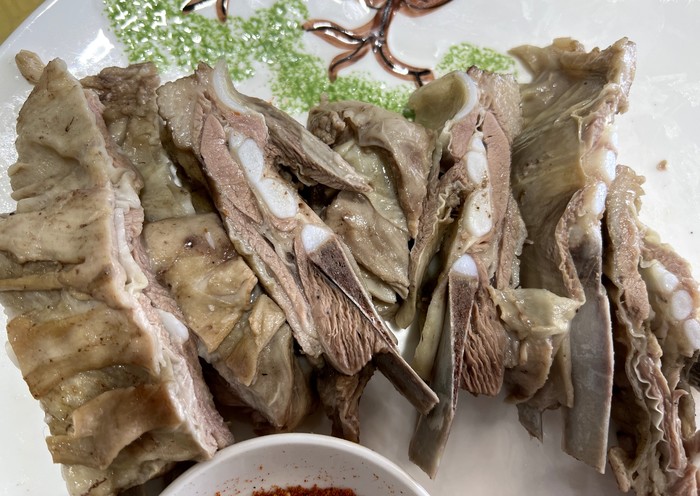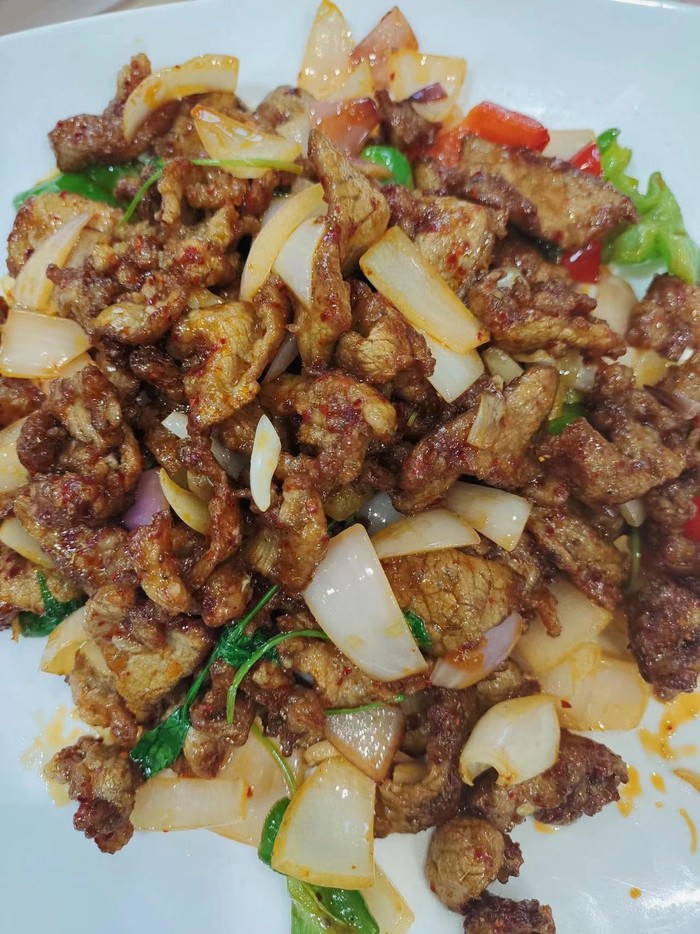 他家有好几种套餐,不过这次我们准备多吃肉,就直接单点了一些特色菜。|手抓羊肉^这道菜第一次吃,上来以后给一次性手套,真的是直接拿着蘸料吃,或者和洋葱一起,新疆的羊肉真的是太好吃了,完全没有膻味 洋葱没有很辣,反而偏甜,解腻,很好吃。|辣子鸡^每次点餐都是少油少盐微辣,司机小马哥吃的很不过瘾,这次特意给他点了辣的。我们感觉就是辣,小马哥说这才正宗好吃,好吧。好吃就行。|炒烤肉^肉先烤过到半熟,然后再爆炒,有烧烤的味道 那却不焦,很嫩。|清炖羊肉^爱喝汤的两位姐姐这次选择了清炖羊肉,汤上面撒了点儿洋葱,这个颜色搭配真的是想要吐槽,不过汤的味道真的不错,肉还可以,比较烂|素炒油麦菜^算是来到新疆以后每餐必点的青菜了,他家菜还比较新鲜,比较嫩,不苦,量很大。