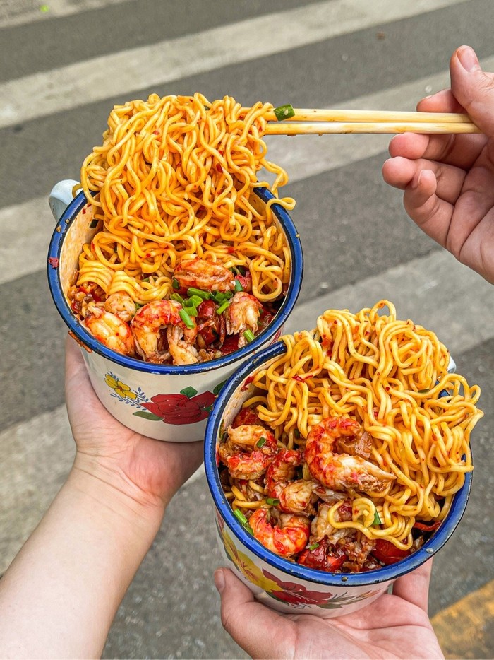 ️茶缸龙虾拌面:这个茶缸实在是太有市井气息啦 面条Q弹爽口 应该是加了辣椒粉