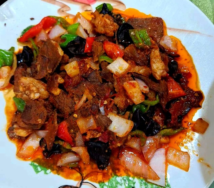 回锅牛肉:第一次在清真餐厅吃这道菜,牛肉偏干却不老,微硬,但是好咬,整体感觉还不错。