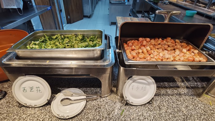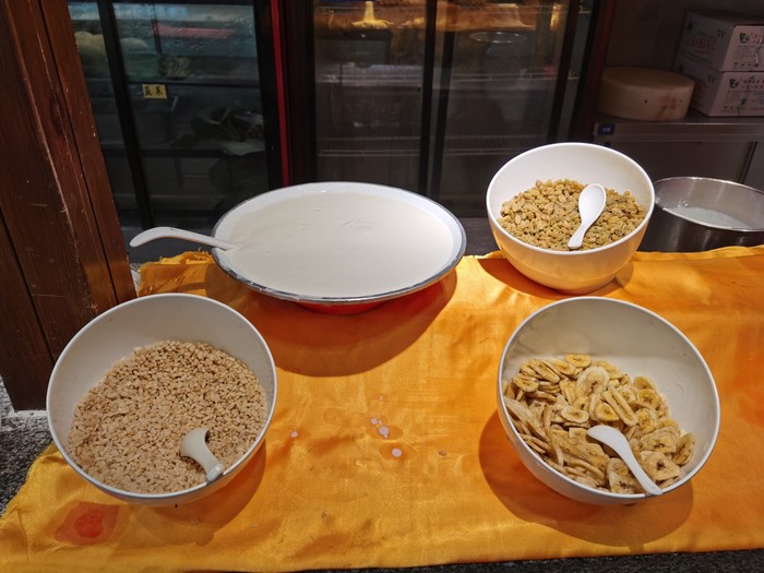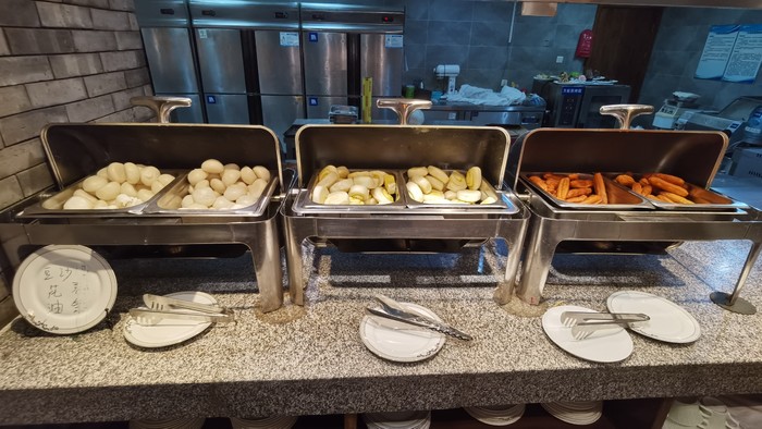酒店餐厅在一层,门口刷房卡检查,有些房间是不含餐的,68元一位。餐厅看着很棒,有很多海鲜,正餐菜品应该会很不错。早餐的种类很多,零零散散几十种,酸奶搭配配了很多干料,早上就有大块头的虾和鱼块,主食也很多。建议小伙伴们在新疆的行程中,每一餐一定要多吃,因为路程都会比较长,而且味道有差距,所以自助的时候一定要选择和胃口的好好吃。