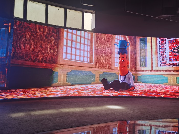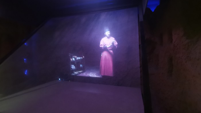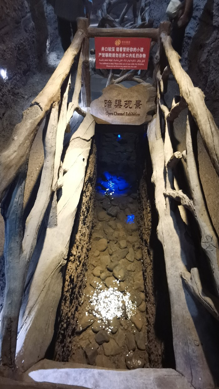 一下车酒感受到了吐鲁番的热情似火。我们人少,司机小马哥也没有安排集合时间,大家基本就一起进去逛了。第一个展厅是关于丝绸之路的介绍,交河驿站的来源,各种视频、文字、雕塑,做得还不错,很科普。出来以后是驿站旧址、马棚复原,然后是一小段葡萄架,还可以看到古井口,然后就是进入地下了。有一段四分钟左右的动画介绍,生动形象,小朋友也可以看的懂。再往下就是坎儿井的暗渠河道层了,可以让大家感受到当年的取水方式,领略古老先民的生活智慧。