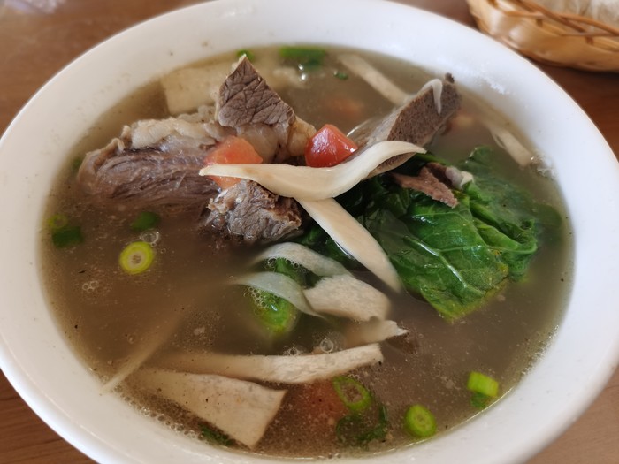 定位发现就在酒店楼下门脸房,进来以后小哥哥就给上了热茶,说了使用团购,但是团购里面的牛骨头今天已经卖光了,所以不能使用只能单点了。想点大份牛排丸子汤,老板也问了一下后厨是不是还有,后来勉强凑了四份,看来实在是太火了,每份送一个油搭子。牛排丸子汤 很大一碗,里面有杏鲍菇、青菜、西红柿、胡萝卜、牛肉丸子、大块牛排。颜色搭配很漂亮,牛排上肉很多,炖的很烂,油搭子是咸口的,白白的,感觉像发面小花卷,搭着肉汤一起吃,汤口淡的人吃着微咸,加了胡椒,容易出汗,建议搭配热茶或者特色卡瓦斯一起。