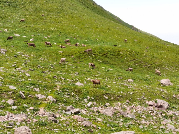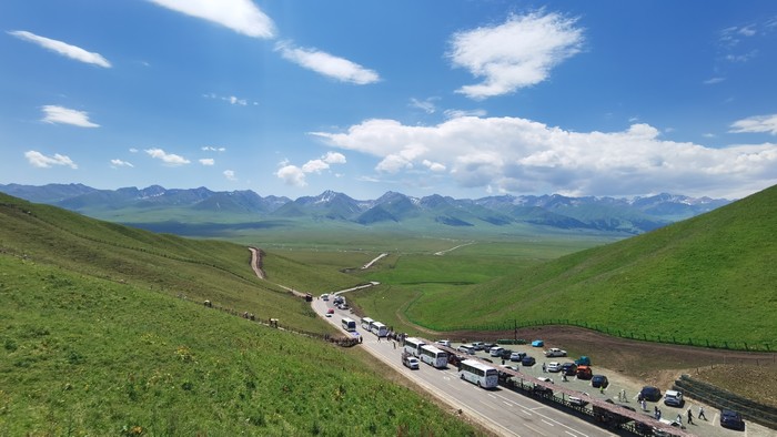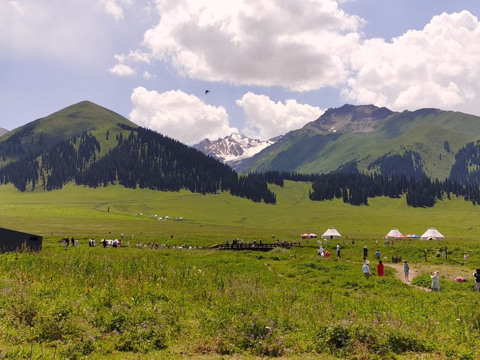 到达那拉提后,先乘坐景区交通车,站点1是个观景台,也可以从大门缆车上来,可以直接感受远处的蓝天、白云、草甸、雪山带来的视觉冲击。有网红小羊可以拍照,20元一次。不过个人感觉没太大必要。站点2主要是骑马和直升机体验,我们直接到了第3站游牧人家。行程时间短的小伙伴可以在这里拍拍照,然后原路返回,距离集合时间>2小时的小伙伴可以我们一样继续前进。购买前往雪莲谷的交通车,人满发车,有两站,建议先前往第二站,因为景色更漂亮,距离雪山更近。