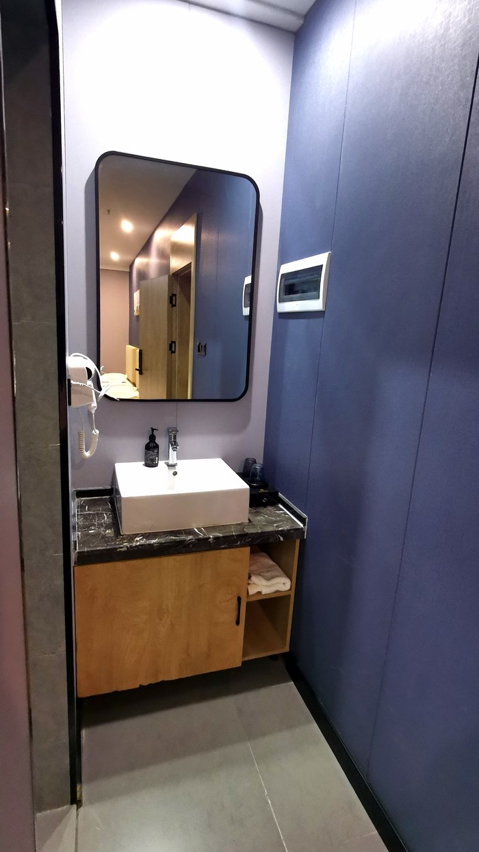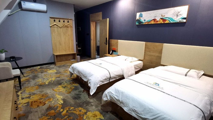 酒店外形很漂亮,设计的很好。楼不高,我们住在四层,房间面积很大,有尖顶小窗户,卫生间干湿分离。酒店插卡后,门口的灯会亮,走廊看着很漂亮。早餐餐厅就在四层,餐具在外面,自取。不用查房卡或者餐票,直接用餐,比较大气。菜品都是炒青菜和一些小菜,主食有好几种,喝的有粥和咸奶茶。