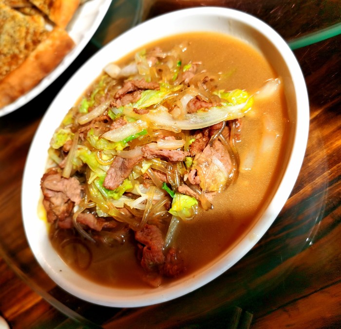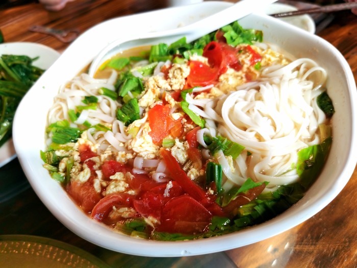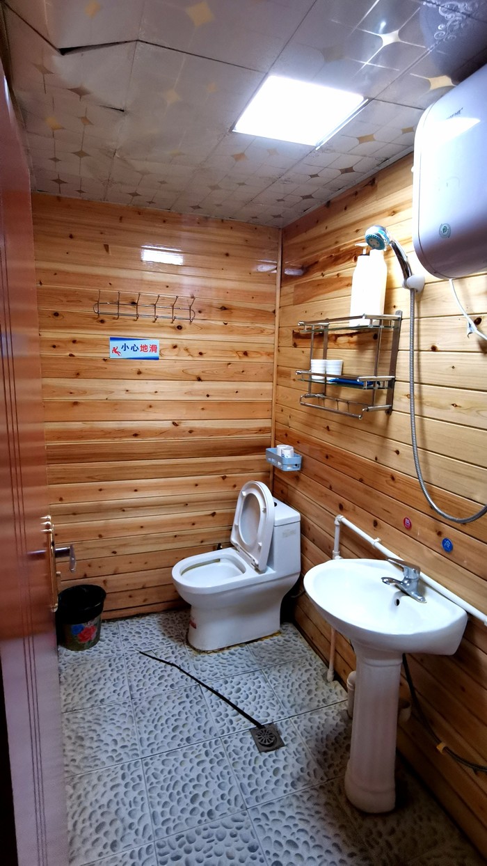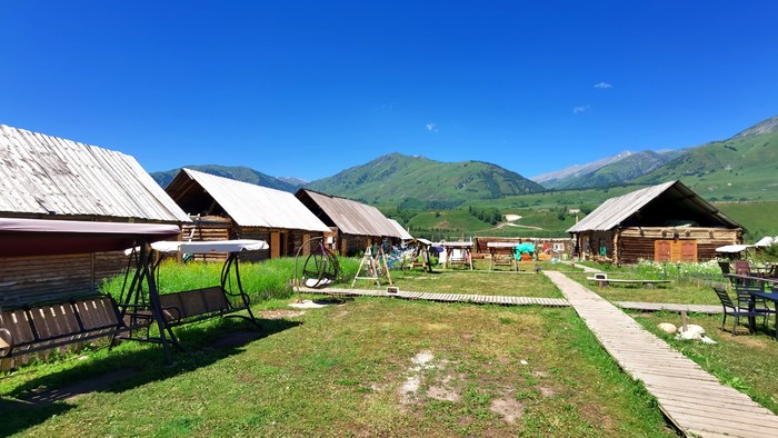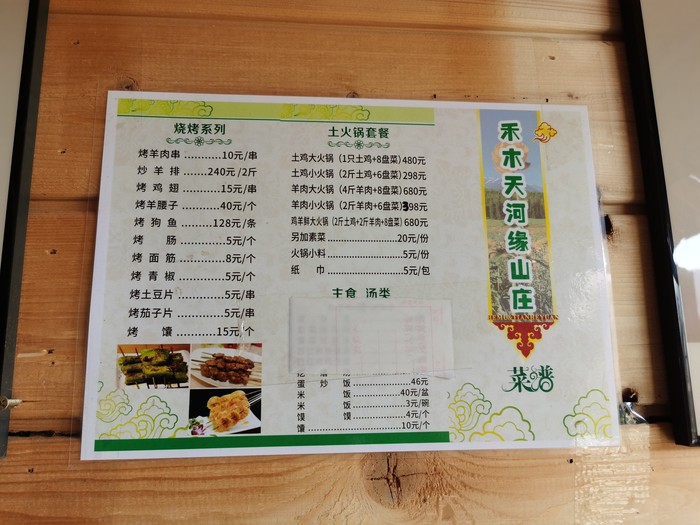 山庄大概在村子中间的位置,院子很大,有很多秋千。房间面积不大,不过设施齐全,热水充足。但是极不隔音,邻居大哥的呼噜声我听的清清楚楚……这边有个不成文的规定,在店里吃一顿正餐,第二天就可以免费送早饭。餐厅价格都是明码标价,我们晚上回来点了几个清淡的菜和一些主食,还让老板帮我们切了自带的哈密瓜,老板很nice,完全没有介意我们消费低,第二天照样送了早饭,比在喀纳斯新村要好太多。