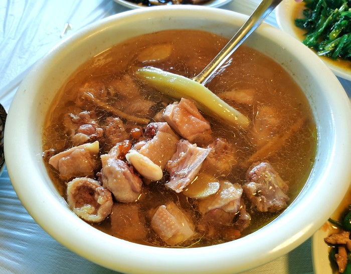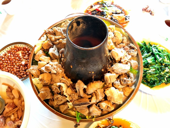 我们直接团了4-6人餐,然后又点了招牌的党参蒸土鸡,这道菜比较费火候,每天只有三份,我们是第二份,很幸运。党参蒸土鸡:这道菜得到了东莞小伙伴的大力好评,终于吃到了比较正宗的,肉肉给的很多,鸡汤鲜香,不太油,肉质嫩,可以直接蘸汁吃。图瓦土火锅:满满一大锅羊肉和鸡肉,都推在上面,肉一定要及时吃,不然会粘锅上。肉肉下面还有很多粉条、青菜、肉丸子、蟹棒、虾饺等等,吃了以后还可以加汤继续涮其他菜品。清炒油麦菜:直接地里现摘现炒,好吃不涩。