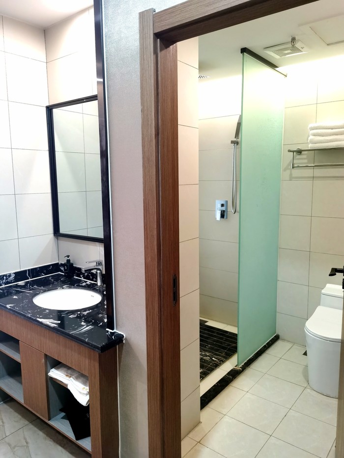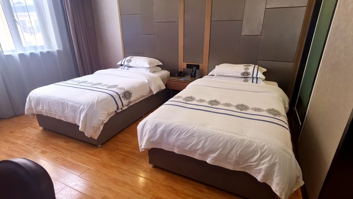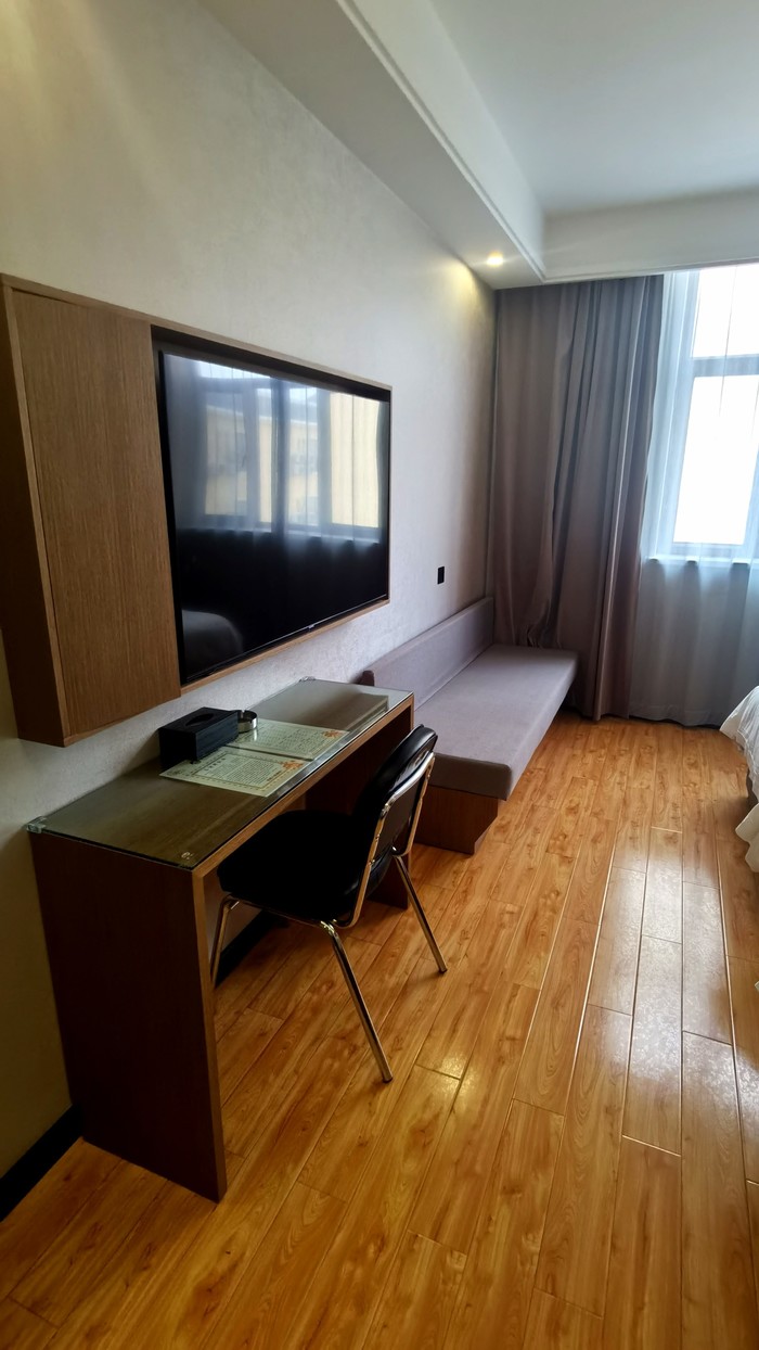 酒店是舒适型酒店,面积比较大,书桌、衣柜都很新,卫生间完全干湿分离,浴室地板防滑,很安全。早饭餐厅在一楼,7点多就可以来吃饭,有奶茶和粥,主食有馒头,小花卷,还有几个青菜和小咸菜。
