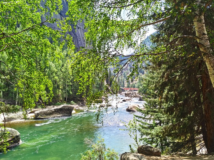 因为是我们的最后一个景点,于是我们继续乘坐电瓶车深入,下车后两侧的景色更好看一些,可以到走河边拍照。最远可以走到瀑布下边,远处还有一座年头不短的小桥。