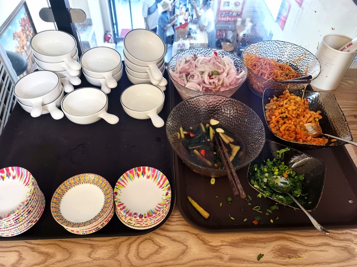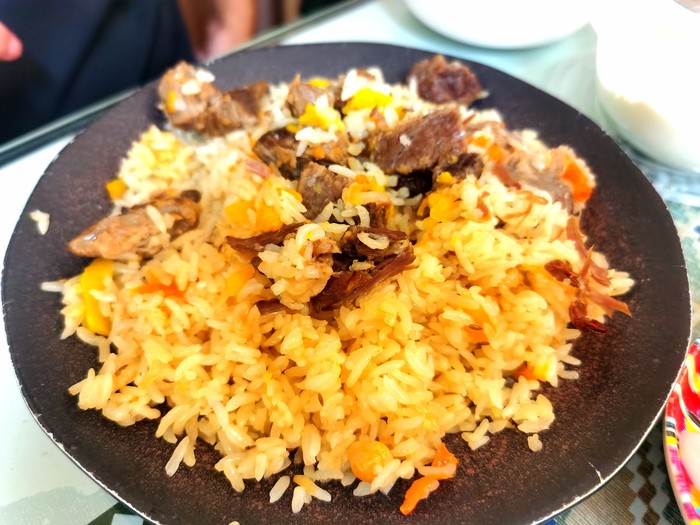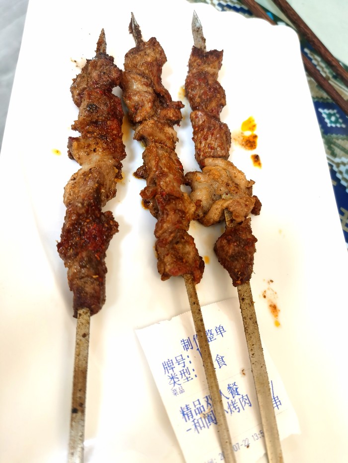 来的时候可能刚好是饭点,人满满的。网上团了双人餐,门口扫码核销后,直接自己拿着酸奶喝桌号上楼找位置。实在人太多,直接和两位大哥拼了桌。小菜和骨头汤都在门口,直接自取,骨头汤没有那么浓,不过叶部咸,很解渴。手工酸奶:盒装,也可以直接买走,5元一份,价格很便宜。酸奶制作时候稍稍放了一点糖,不会像很多人家那种纯酸的,喝的时候刚刚好。羊肉串:来新疆后吃到的最便宜的串串,上来的很快,烤的很嫩,不是咸口,很好。羊肉抓饭:上面是一整块羊肉,肥瘦相间,啃着很过瘾。碎牛肉抓饭:一两厘米长的牛肉小块,都是瘦肉,很入味。抓饭不会特别油,略淡,可以搭配小菜一起。