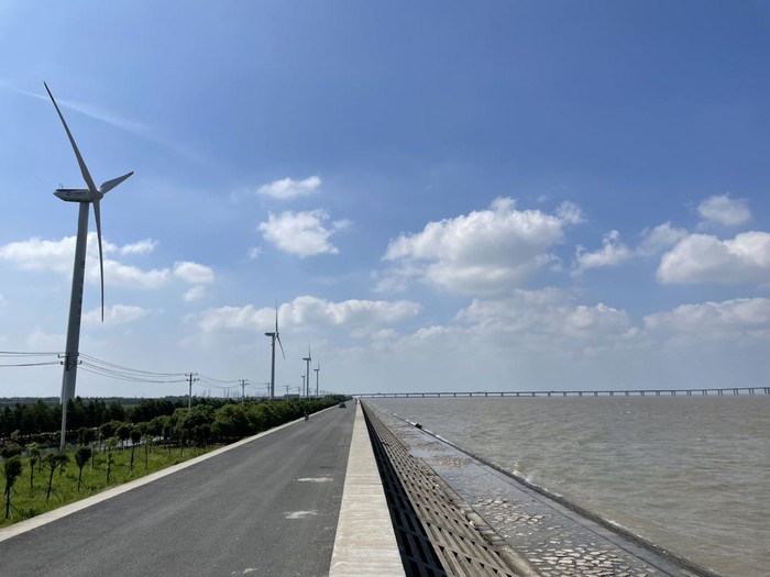 4、然后按照图3红色路线继续行驶,在十字口转弯后就上沿海大堤了(图4),这里可以欣赏蓝天白云下的风景,沿着海岸线兜风简直不要太爽。