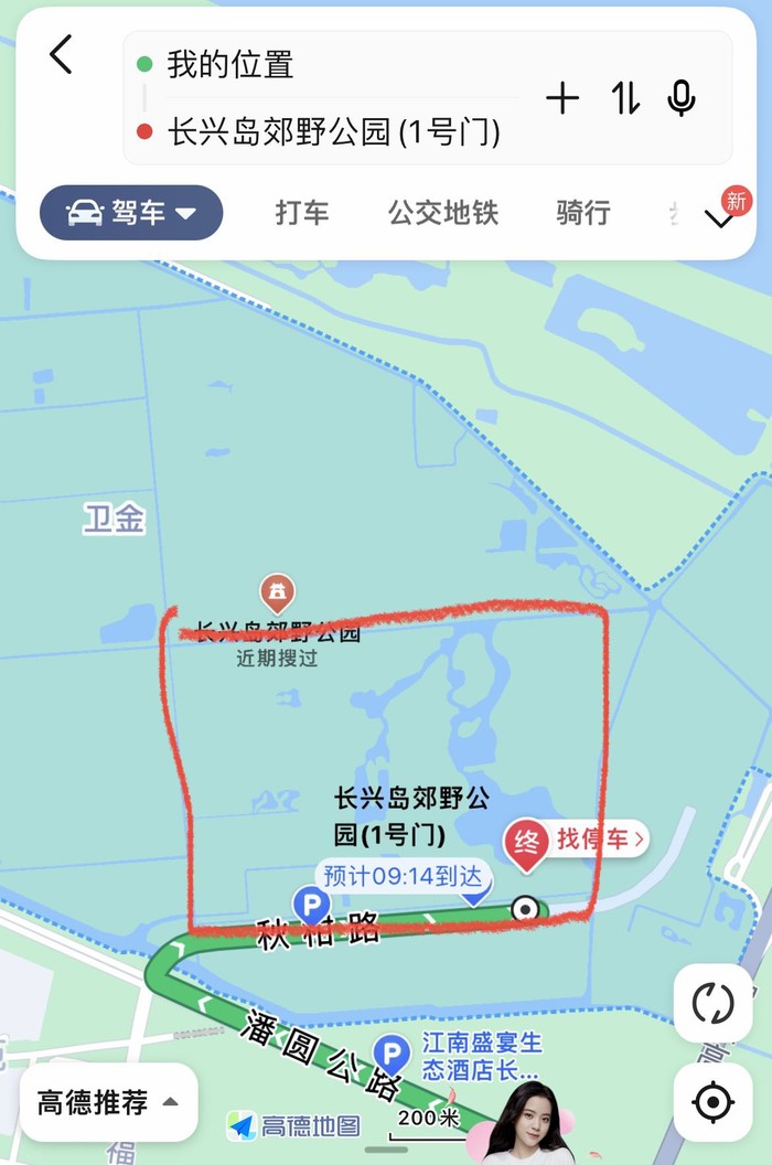 6、导航到长兴岛野郊公园1号门(2号门离游玩中心太远,不建议到2号门哦),建议只在图中红圈范围内游玩(图6、7、8),其余地方基本没什么玩的,都是些种植园,橘子树特别多,时间充裕的话也可考虑转转。