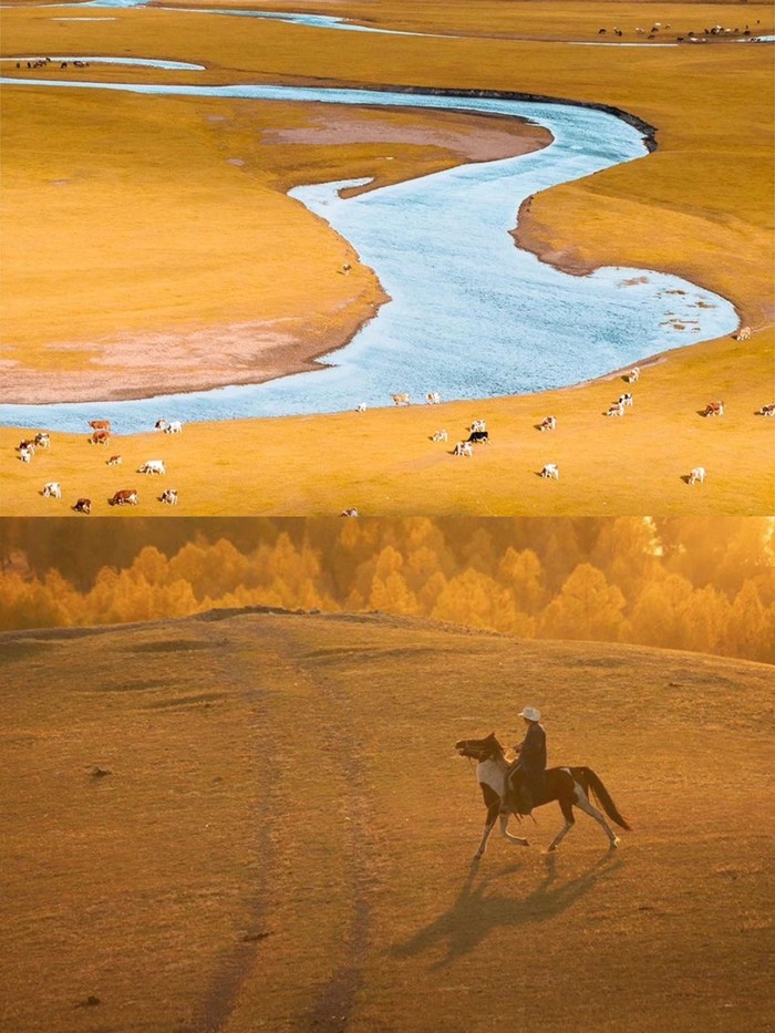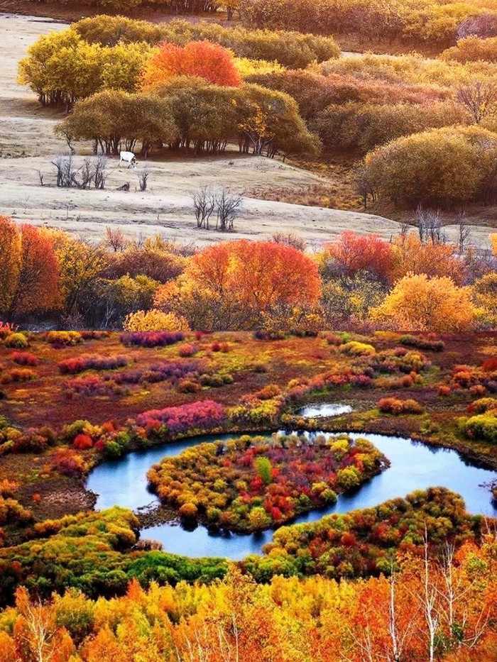 还有白色的桦树林,四季常青的松树,各种颜色的湿地,水天一色的湖泊,更有秋日大草原上的蜿蜒的曲水