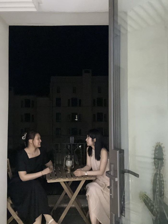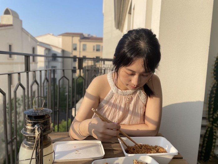 坐在阳台上吃前一天打包回来的饭,哈哈
