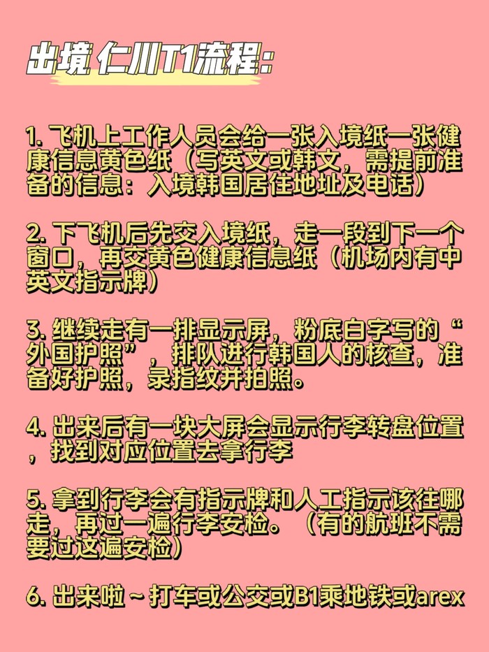 1. 飞机上工作人员会给一张入境纸一张健康信息黄色纸(两张最好都在飞机上填写好,写英文或韩文,需提前准备的信息:入境韩国居住地址及电话)没带笔也没关系,下飞机后,机场有提供笔的位置