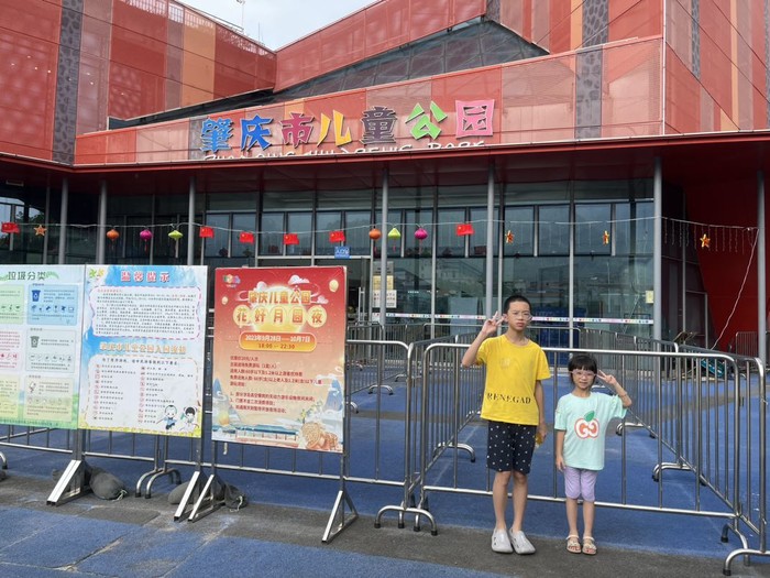 2023年10月4日星期三,天气阵雨转晴,我们一家四口和朱仔一家三口自驾游到肇庆市儿童公园玩耍一天。