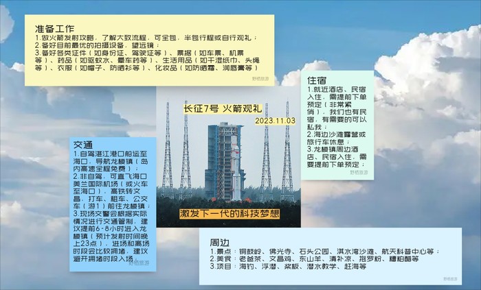 准备工作1.做火箭发射攻略,了解大致流程,可全包,半包行程或自行观礼,可以咨询;