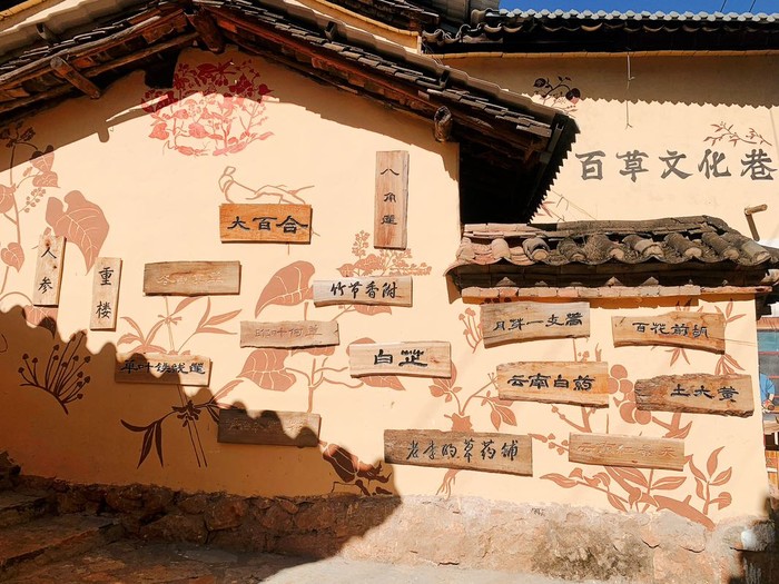 白墙之上是村民们创作、绘画的各种草药、白族风情手绘,不仅白族风情浓郁,而且中草药文化突出。