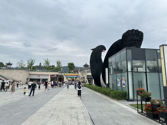 整个广场有些脏乱差,熊猫雕塑一周围满了人,熊猫雕塑有点脏脏的……
